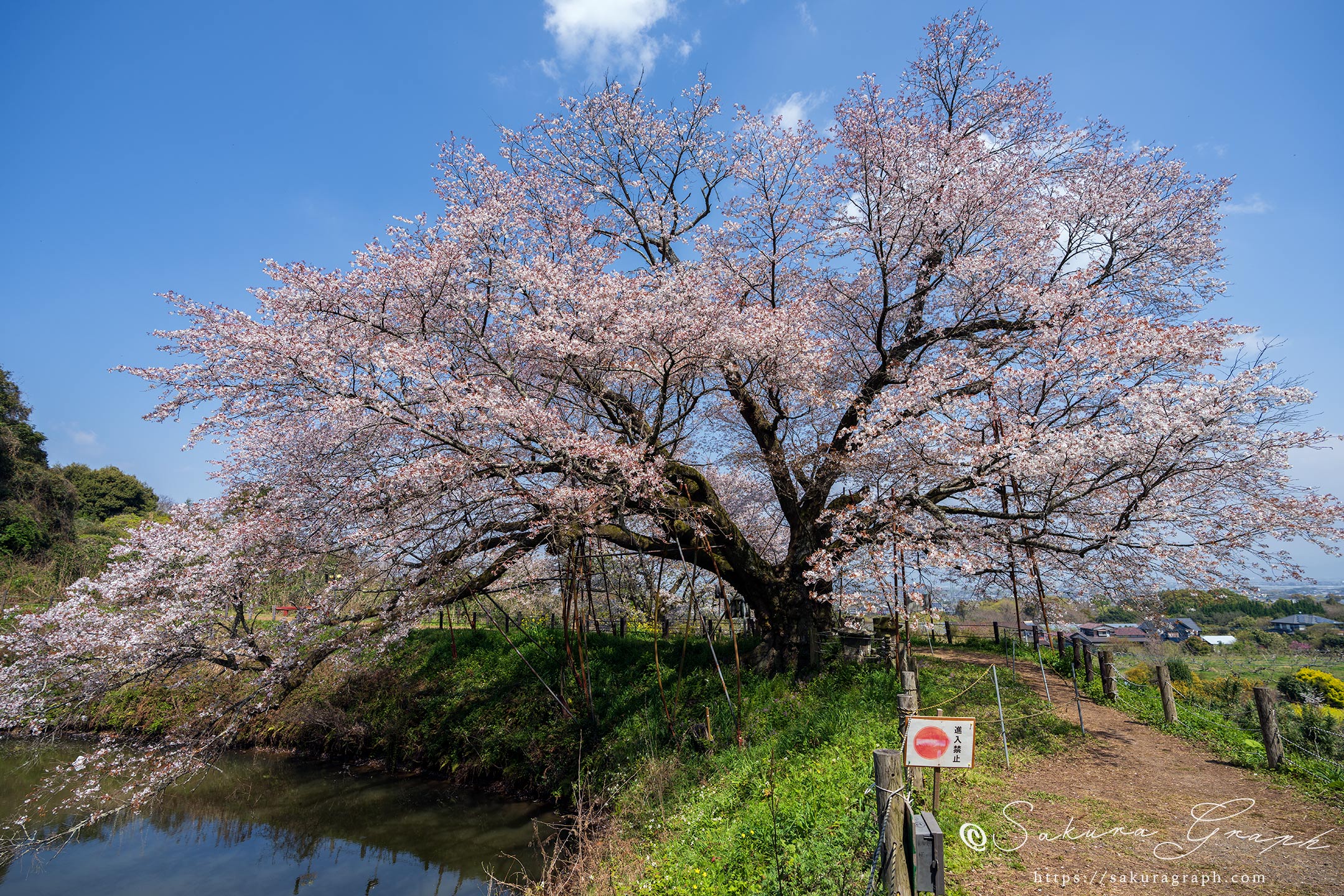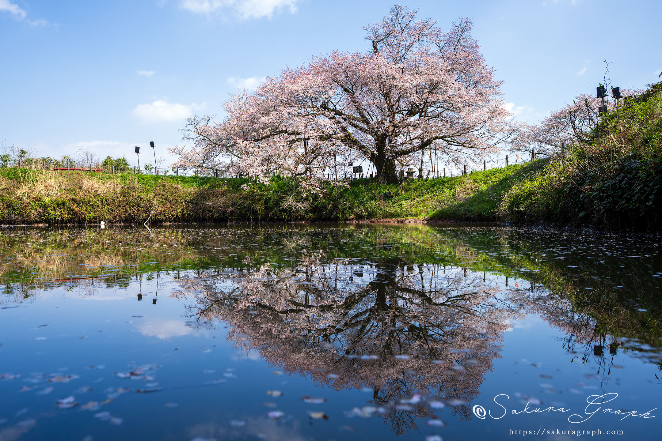 | Note | 昭和天皇の御大典を記念し、地元住民が植えたとされるヤマザクラ。溜池に映る逆さ桜が有名で、ライトアップ時には多くの花見客が訪れる県下屈指の人気桜。1991年の台風で損傷したが治療により回復し、毎年見事な花を付ける。 |