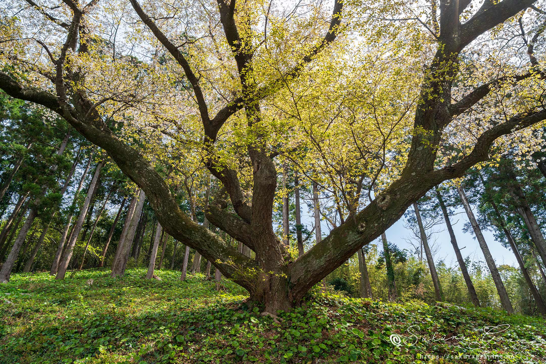 坂を登って桜のそばまで近づける。四方におおらかに幹を伸ばす株立の桜で大桜との名前にも負けていない雄大な桜だと思う。大枝から伸びた比較的新しい枝からは新緑が輝いていた。