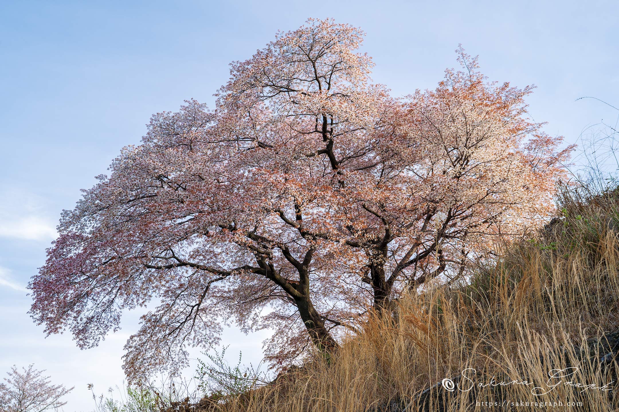 平家一本桜からナビでは約9分、離合の難しい細い山道が続く。途中池沿いの道を進んだ先にかろうじて車を止めるスペースがあり、そこで車を降りて徒歩で向かった。みかん畑の上の尾根に立派なヤマザクラが朝日を浴びている。斜面を登って近づこうとしたが、途中で道らしき道がなくなり、畑に足を踏み入れてしまいそうになるため断念した。後で知ったが、平家一本桜から歩いて尾根伝いに道があり、そこからこの城尾桜の近くまで行けるようだ。機会があれば再訪してみたい。