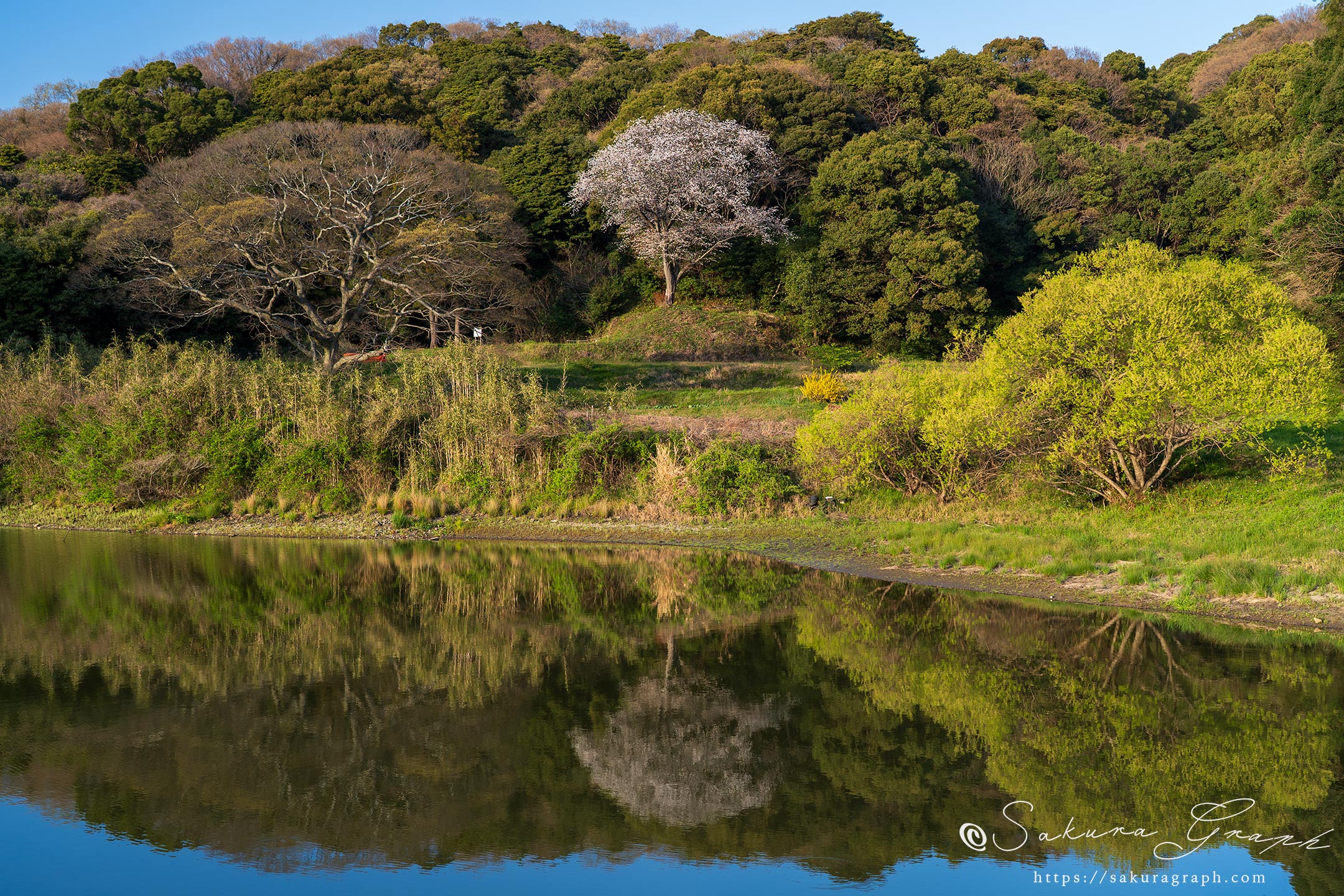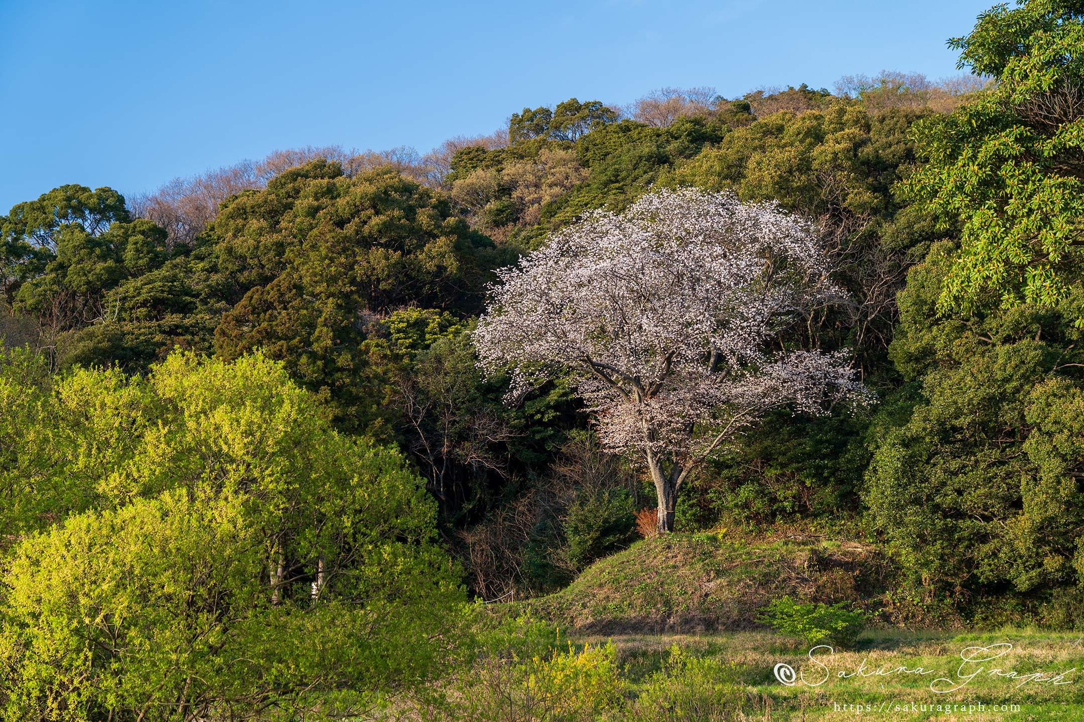 綺麗に整備された小高い丘の上に形の良い大きなヤマザクラが立っている。この辺りは小倉藩家老、島村志津摩公の終焉の地と伝えられ、桜にもその名前がつけられている。志津摩公は長州藩との戦いで活躍した地元の英雄で、その人となりと活躍ぶりが案内板に詳細に伝えられている。
