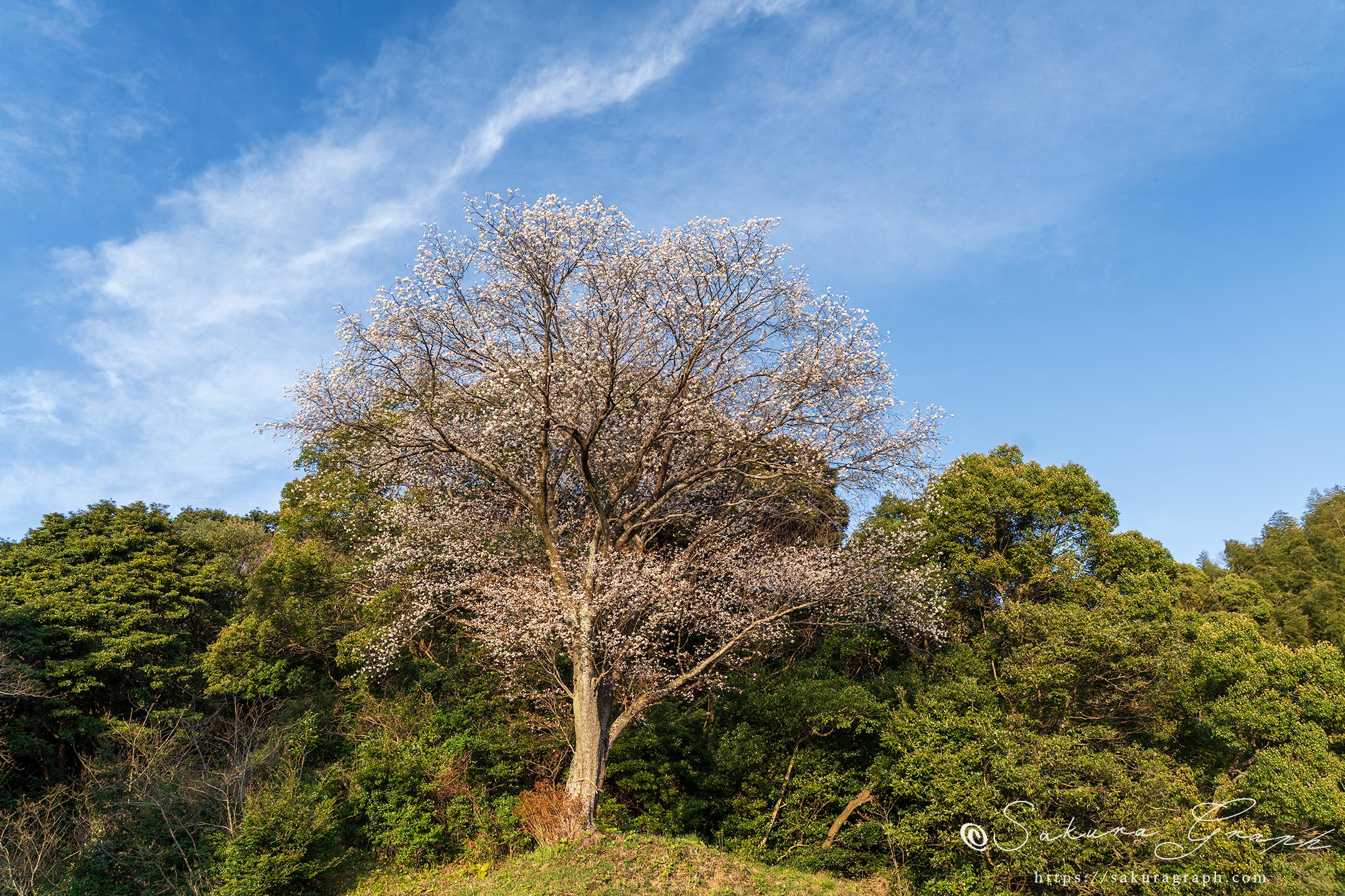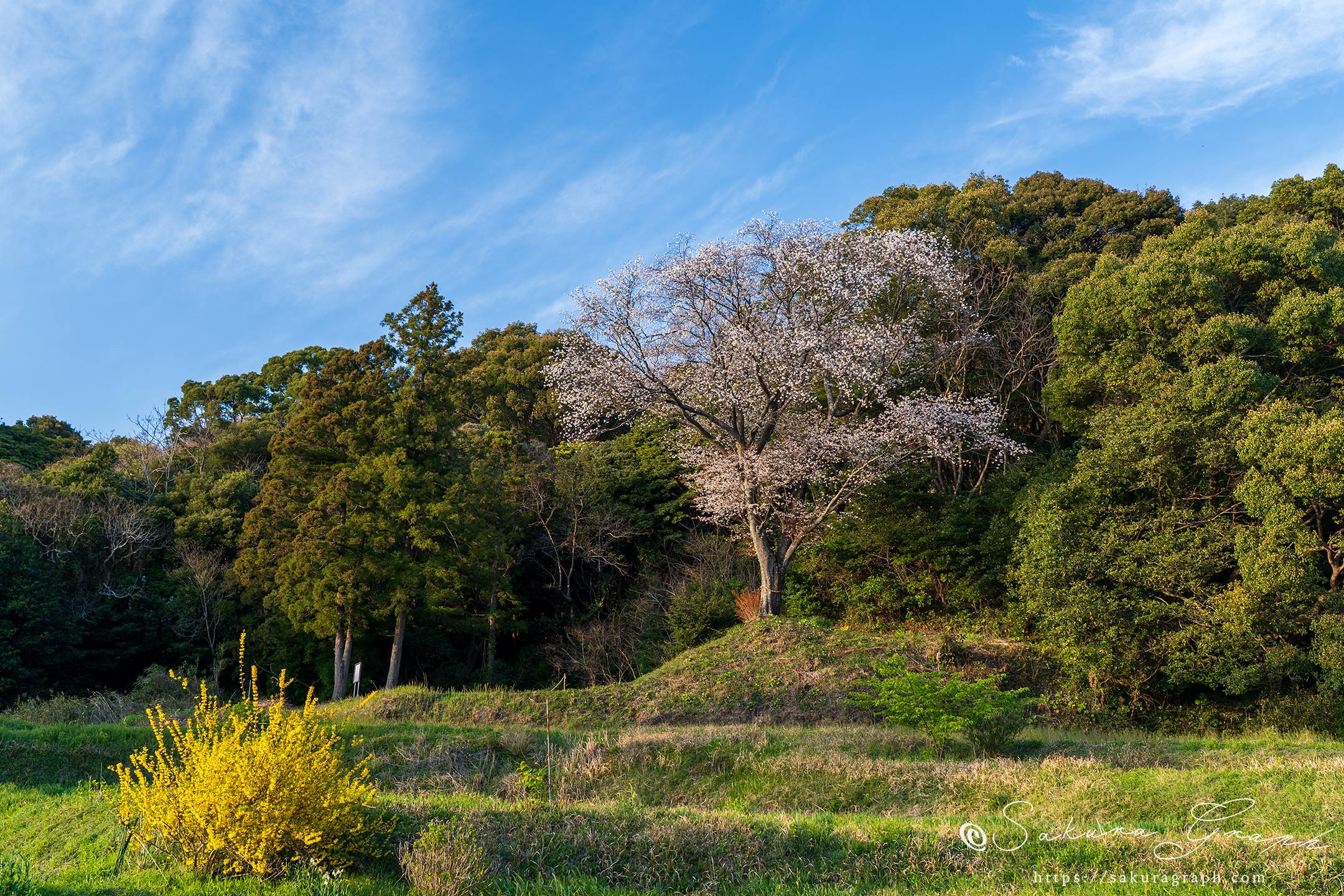 この日は桜の咲き具合や天候に泣かされることが多かったが、最後に訪れたこの地では広く薄く広がっていた雲が途切れ始め、軽やかな筋雲に変わっていった。島村志津摩公の名前は初めて知ったが、桜の咲き具合も空模様も良く、その名前とともに印象に残る場所となった。