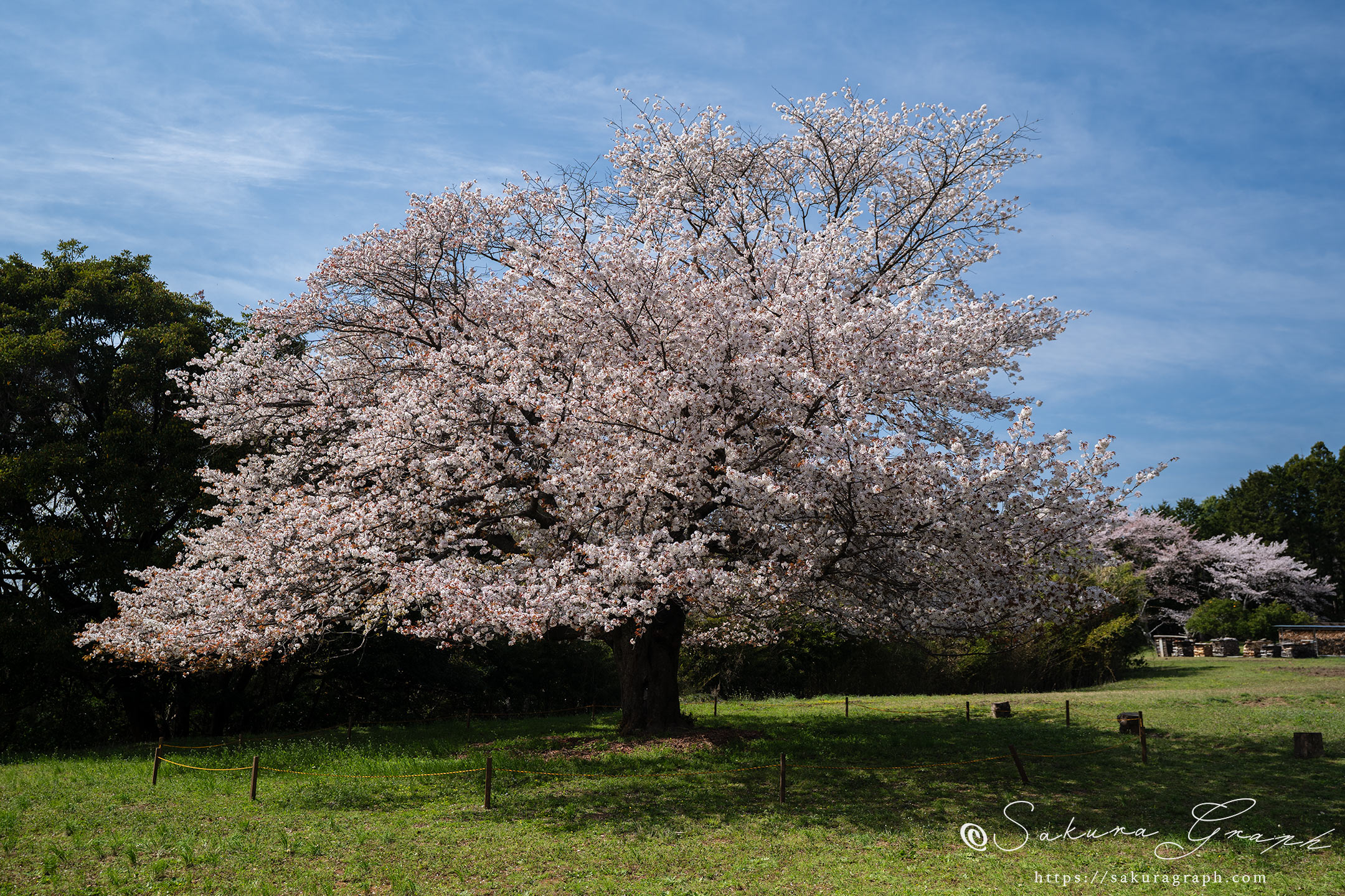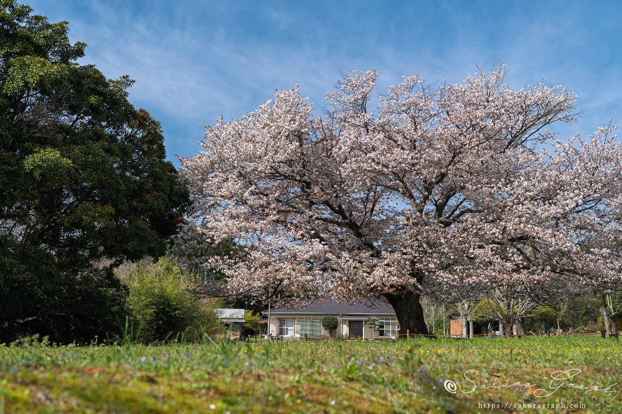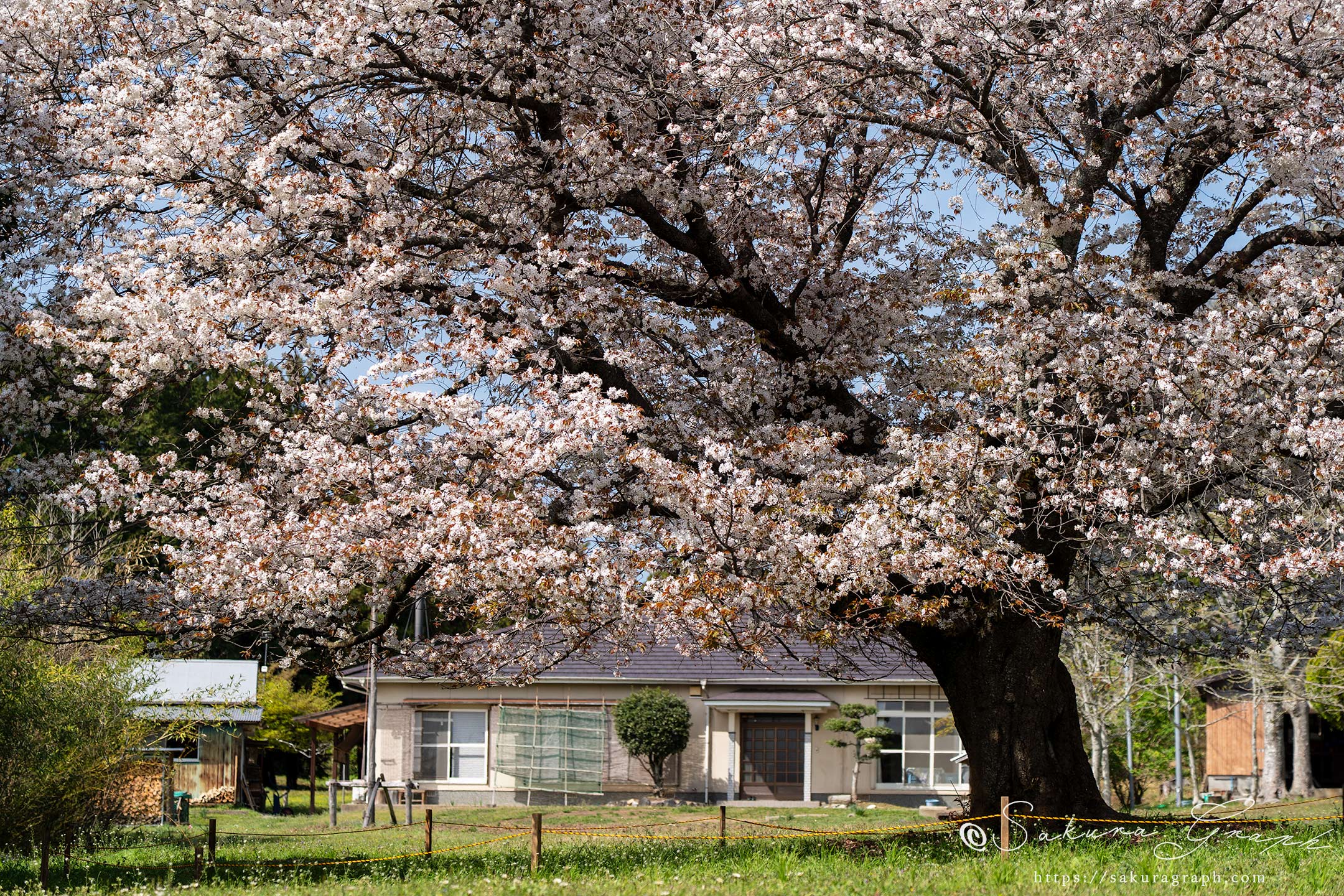 この広場は個人の所有とのことで、奥に平屋の戸建てがある。広場というより広大な庭なのだろう。もしかするとかつては農地で桜は日陰樹として植えられたのかもしれない。若い樹と思われるが枝張りが広く雄大である。