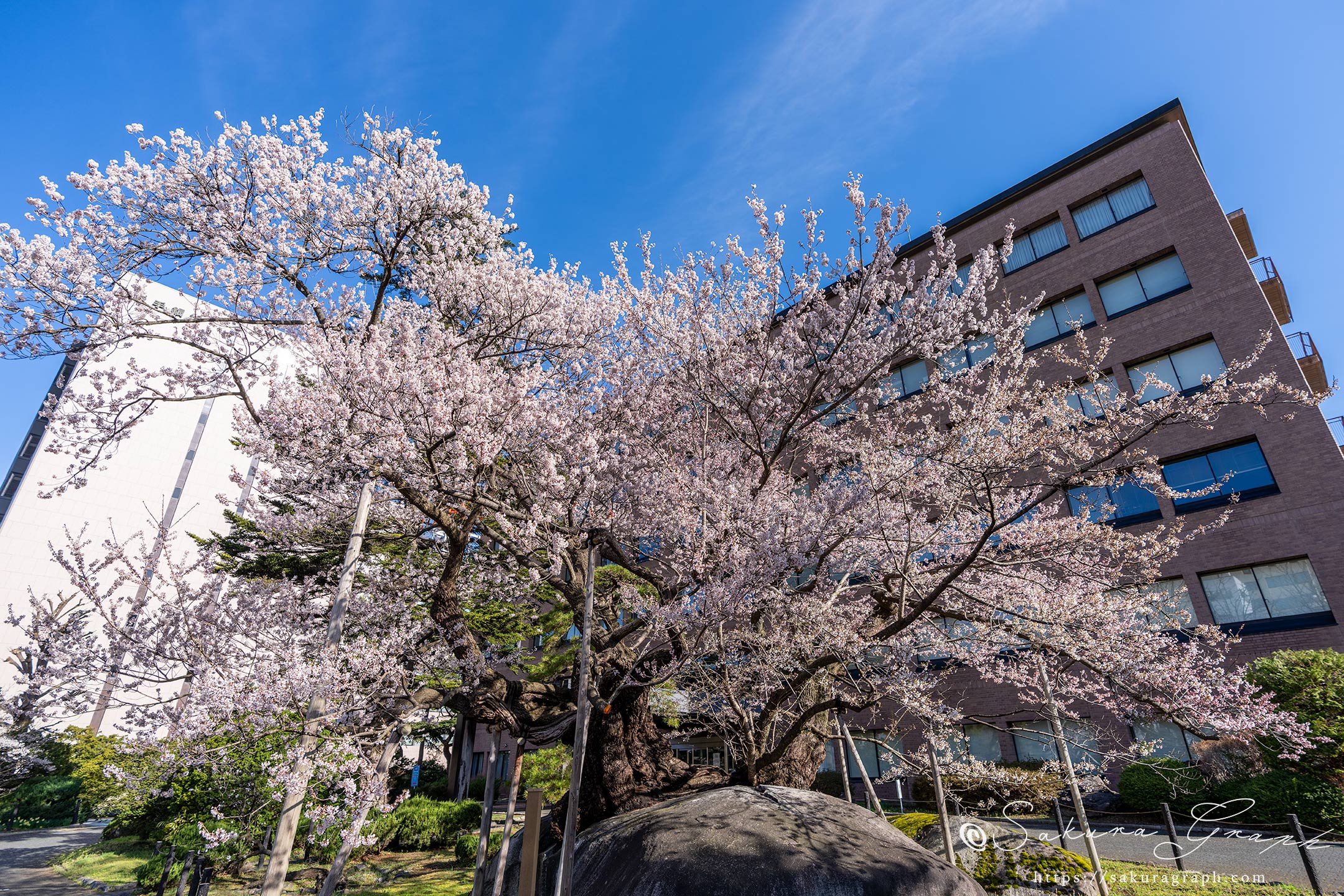 | Note | 盛岡地方裁判所の敷地内に立つエドヒガン。この辺りは元は盛岡藩の家老の屋敷であったと伝えられており、庭石として置かれていた花崗岩の割れ目に入り込んだ桜の種が発芽し、成長したものと伝えられている。割れ目は年々大きくなってきており、その生命力には驚かされるばかり。 |