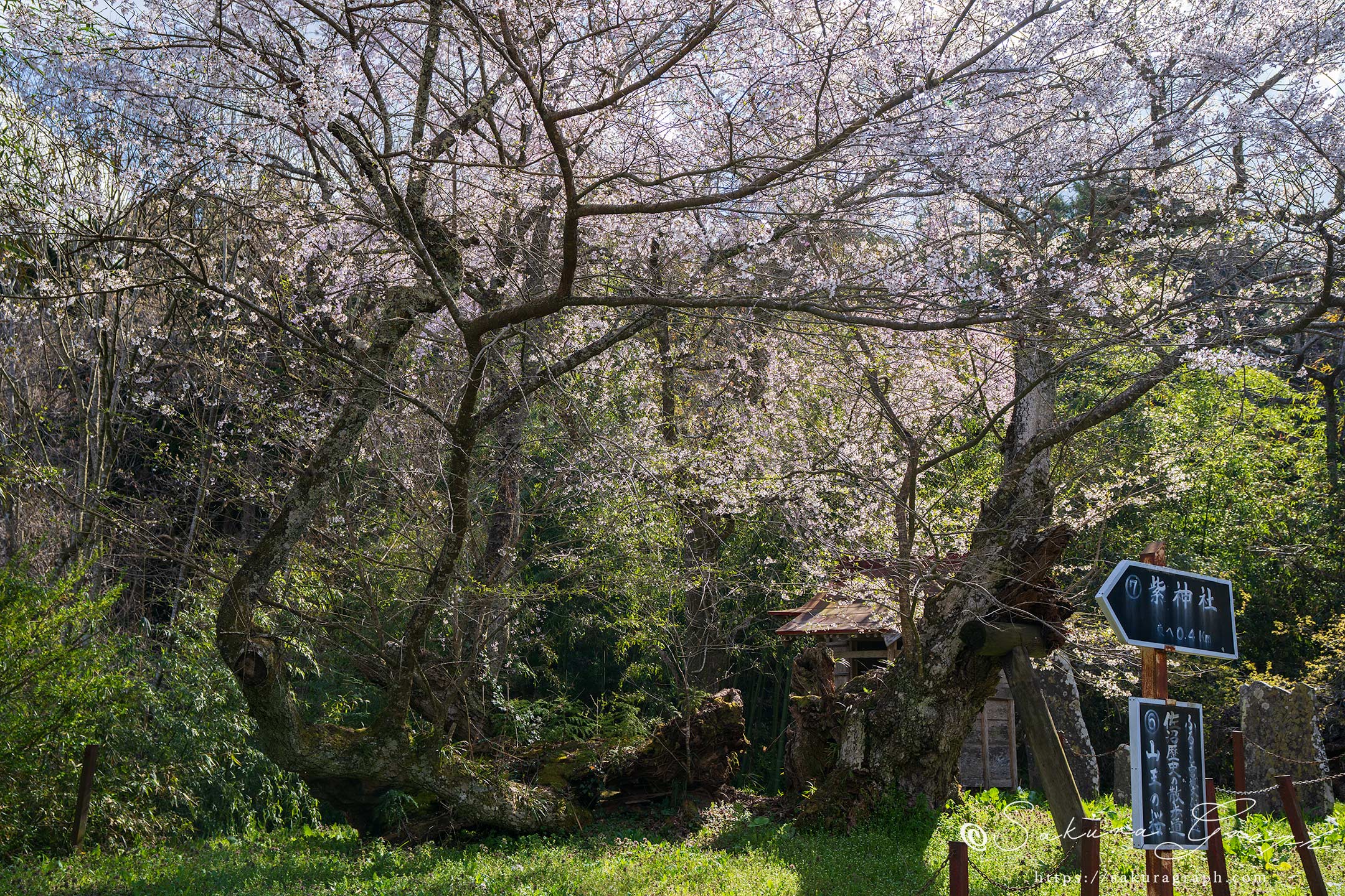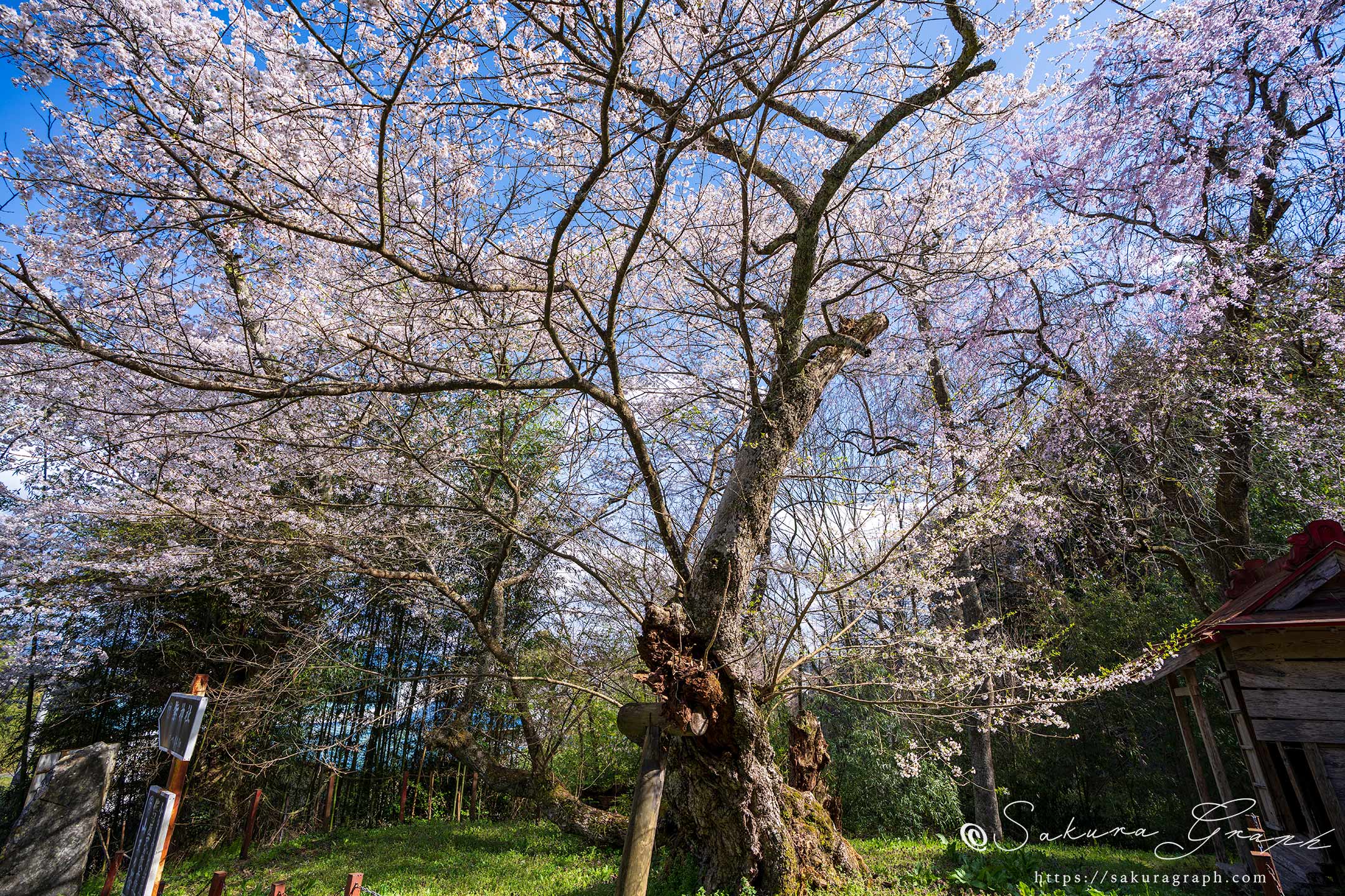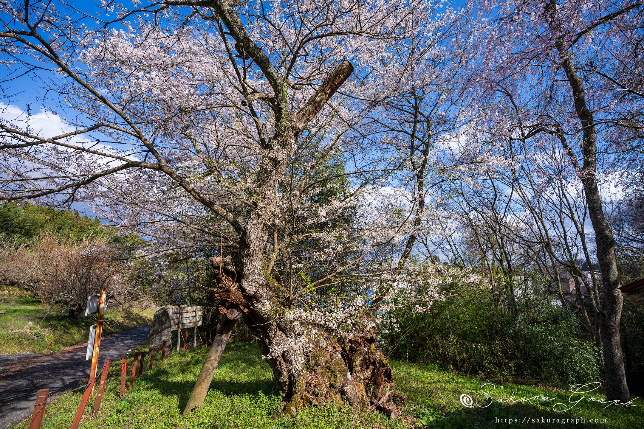 主幹はほとんど失われ、残った幹の一部から新しい枝が伸びて花をつけている。桜の生命力を体現した異形の姿だと思う。案内板には県下最古の桜とあるが、その位古い樹であることは間違い無いだろう。
