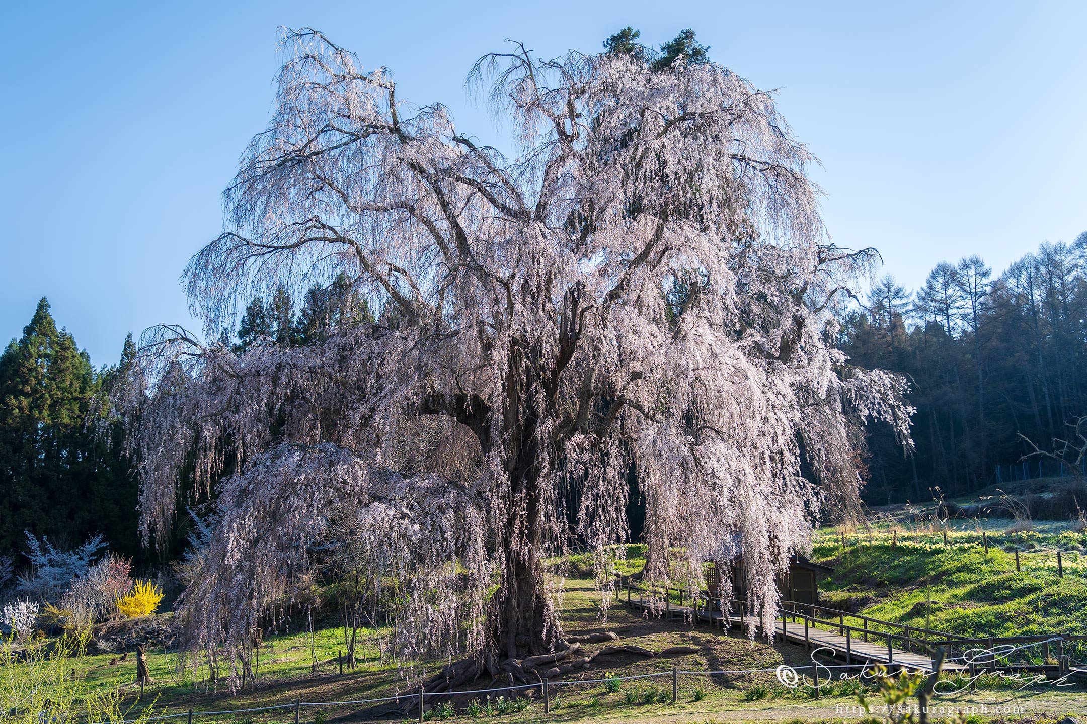 | Note | 旧水中地区の丘陵地に立つシダレザクラの古木。高山村五大桜の一つに数えられ、満開時には薄緋色の滝の如く咲き誇る。シダレザクラが多く点在する高山村でも屈指の人気桜。 |