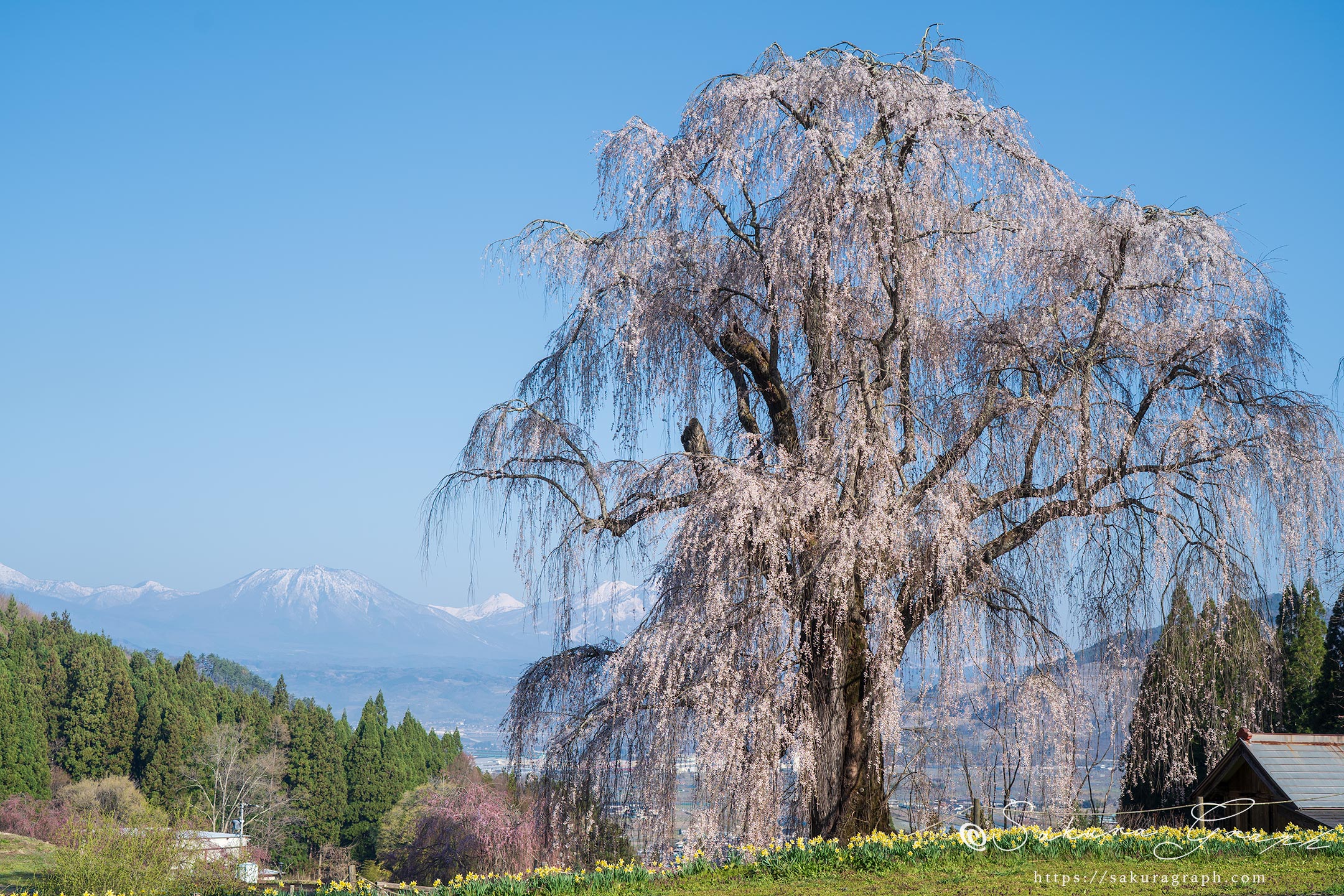 高山村は20年ほど前から桜の里として花見客を集めている。ぶどうやりんごの畑が広がる扇状地一帯には歴史ある桜が点在し、中でも特に見栄えのする5本の桜は「高山五大桜」と銘打たれ、大々的に宣伝されている。ここ水中のシダレザクラはその五大桜の筆頭格と言える桜で、善光寺平を見下ろし、はるか北信五岳を望むスケールの大きな名桜だと思う。